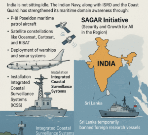 India has also launched the SAGAR initiative (Security and Growth for All in the Region) to build regional partnerships. On the diplomatic front, India has urged Sri Lanka and the Maldives to restrict Chinese ship access. While Sri Lanka temporarily banned foreign research vessels, there are concerns that Chinese diplomatic pressure might soon reverse the decision.